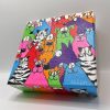 Colors: Bright pink, orange, yellow, green, blue, purple, black, and white