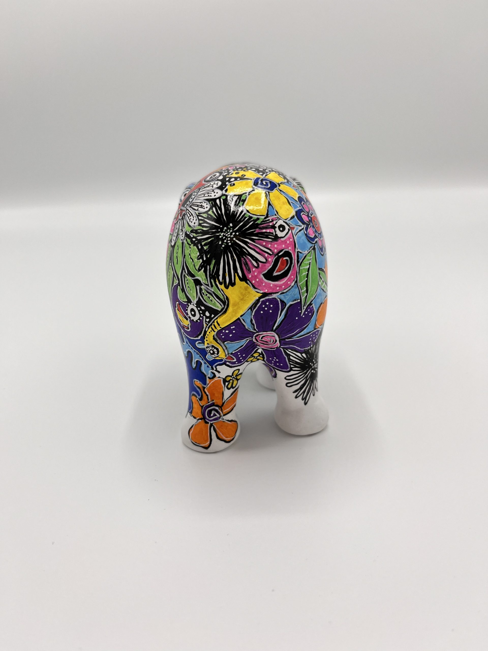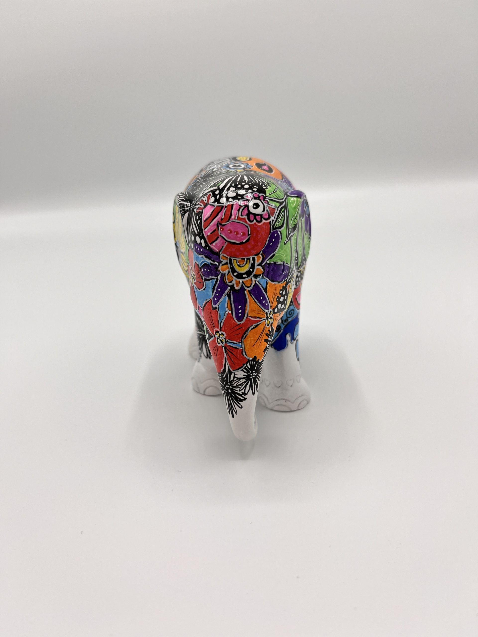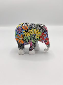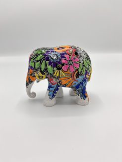This beautiful elephant statue is decorated with colorful flowers, giving it a striking and cheerful appearance. The flowers in bright shades such as yellow, red, orange, blue and green adorn the body of the elephant and form a beautiful contrast with the black details and white legs. Each floral design is detailed and artistically rendered, making this figurine a unique work of art. Perfect for lovers of flowers and colorful decorations, this figurine brings a touch of nature and art to any room.