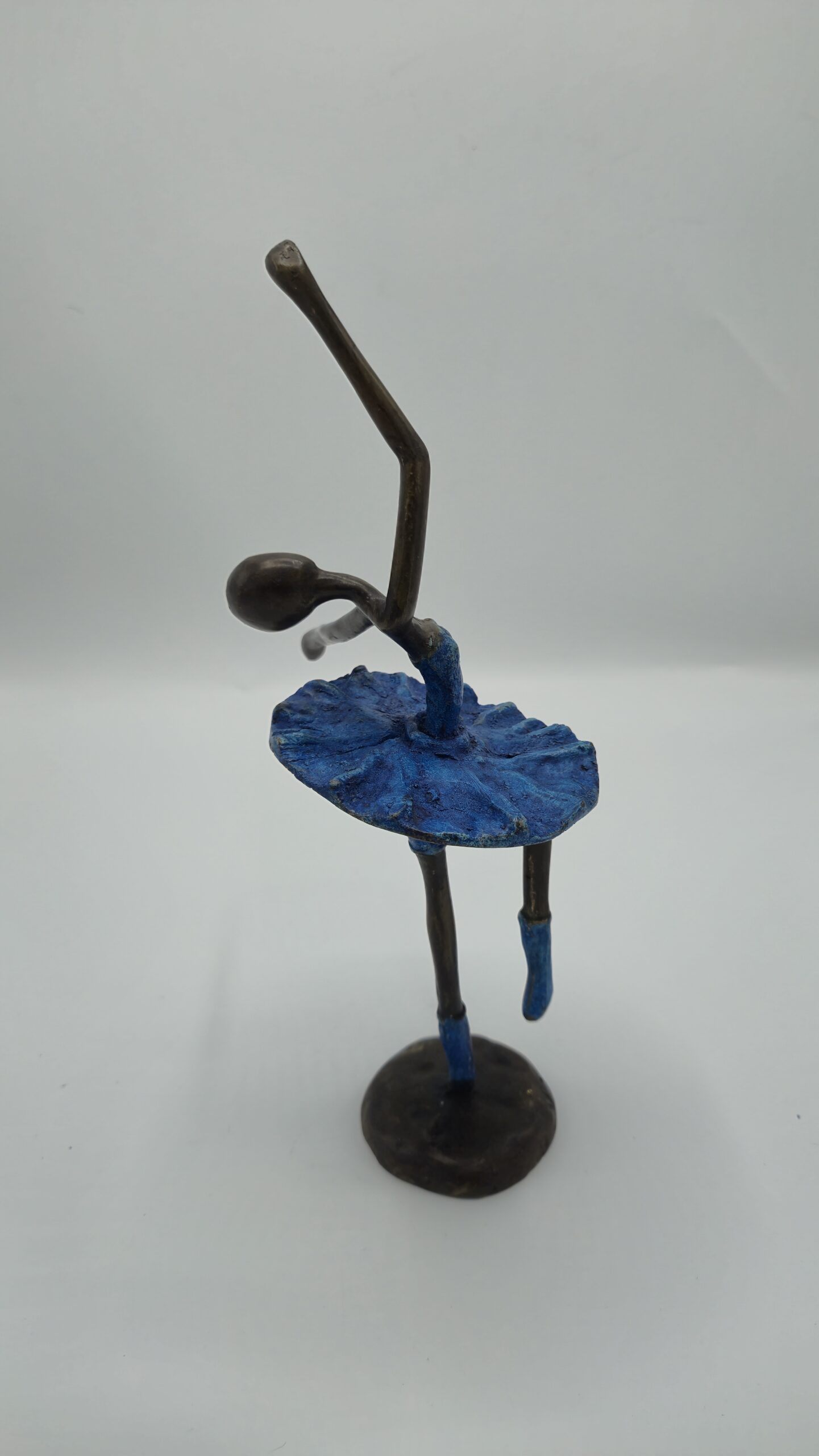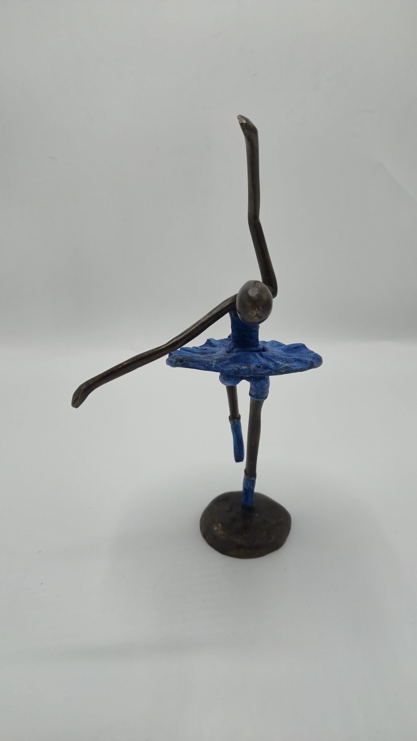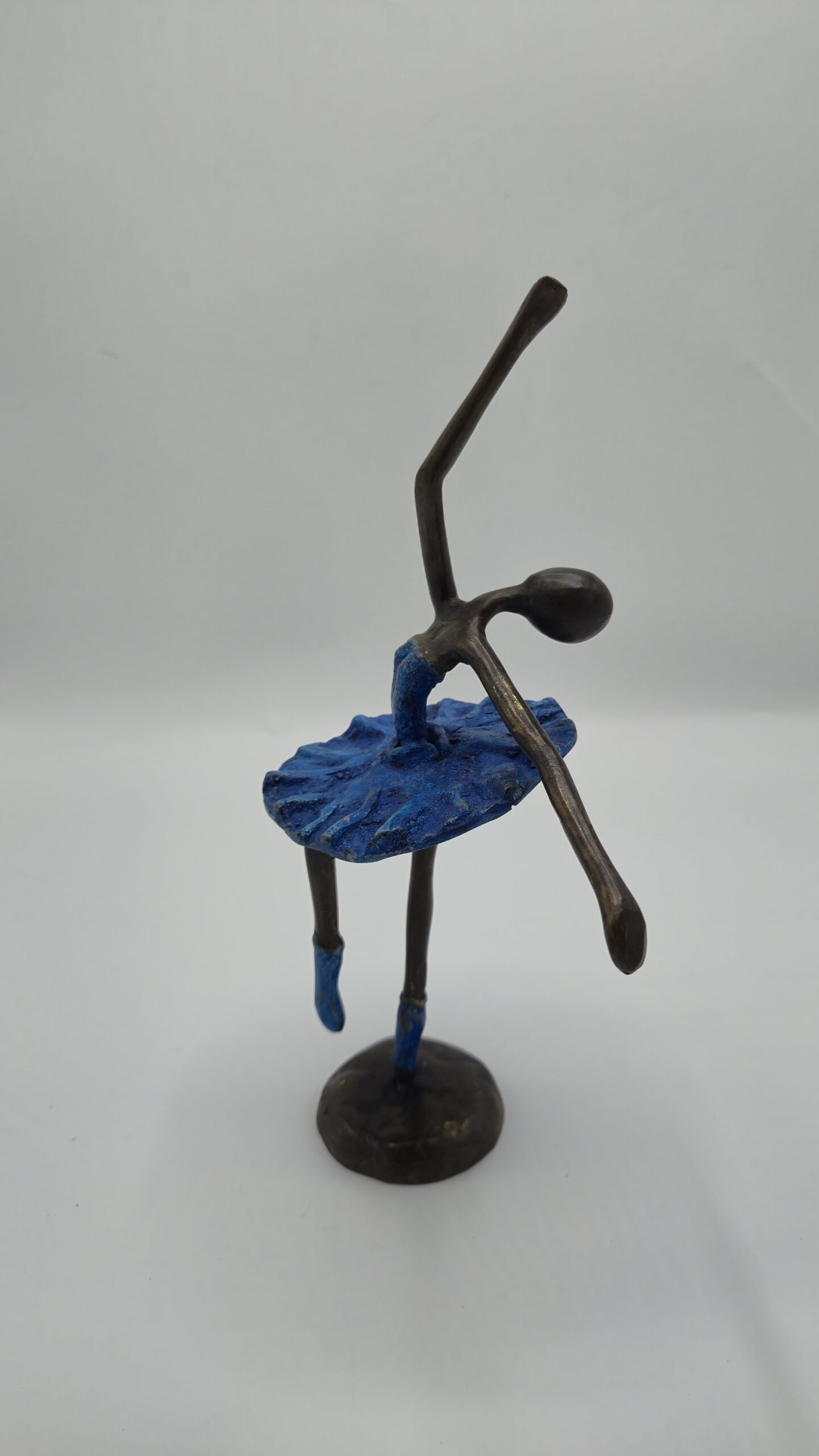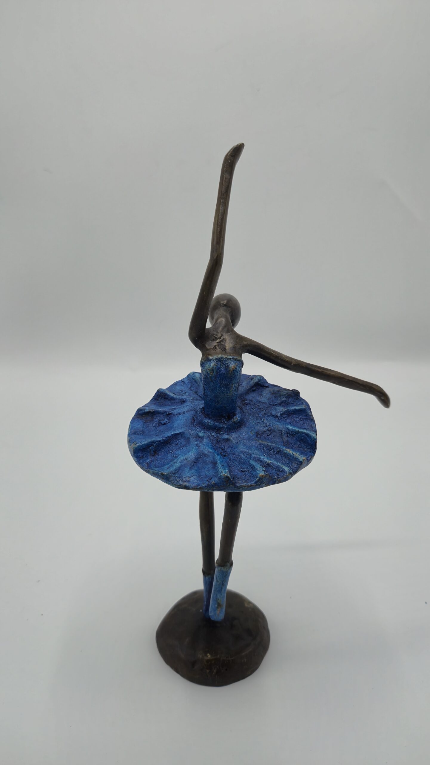 Het beeld is met vakmanschap gegoten uit brons en afgewerkt met een levendig blauw patina op het lijfje, rokje en de balletschoentjes. Deze diepe blauwe tint staat prachtig in contrast met het warme, donkere brons van het lichaam. De combinatie van kleuren versterkt de beweging en geeft het kunstwerk een eigentijdse uitstraling, terwijl het toch een klassiek karakter behoudt.