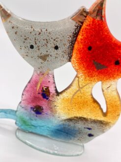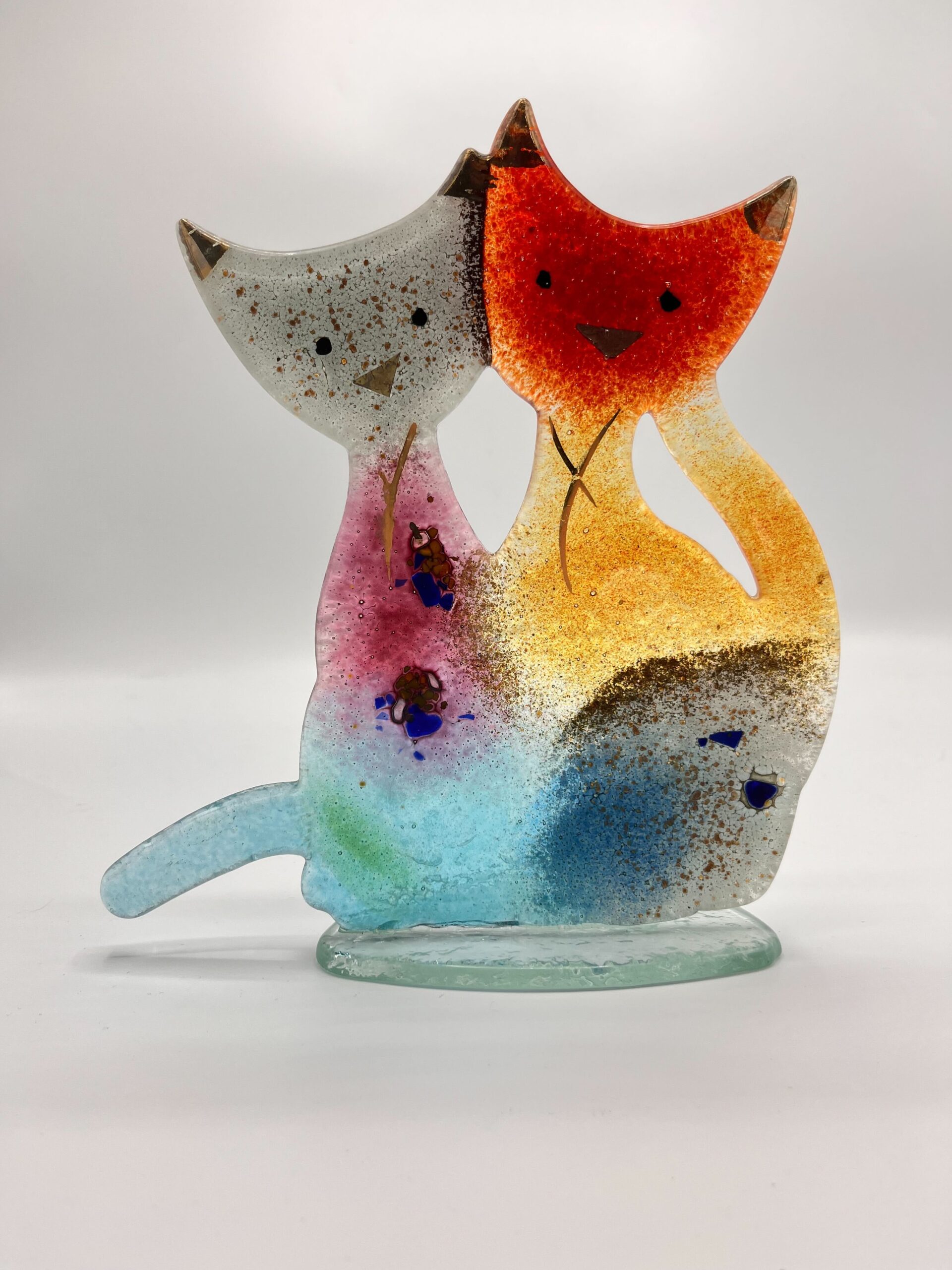 Celebrate the playfulness of love and friendship with this unique glass sculpture. Two graceful cat figures sit snugly against each other, their bodies gracefully intertwined – a tender and cheerful representation of connection.
