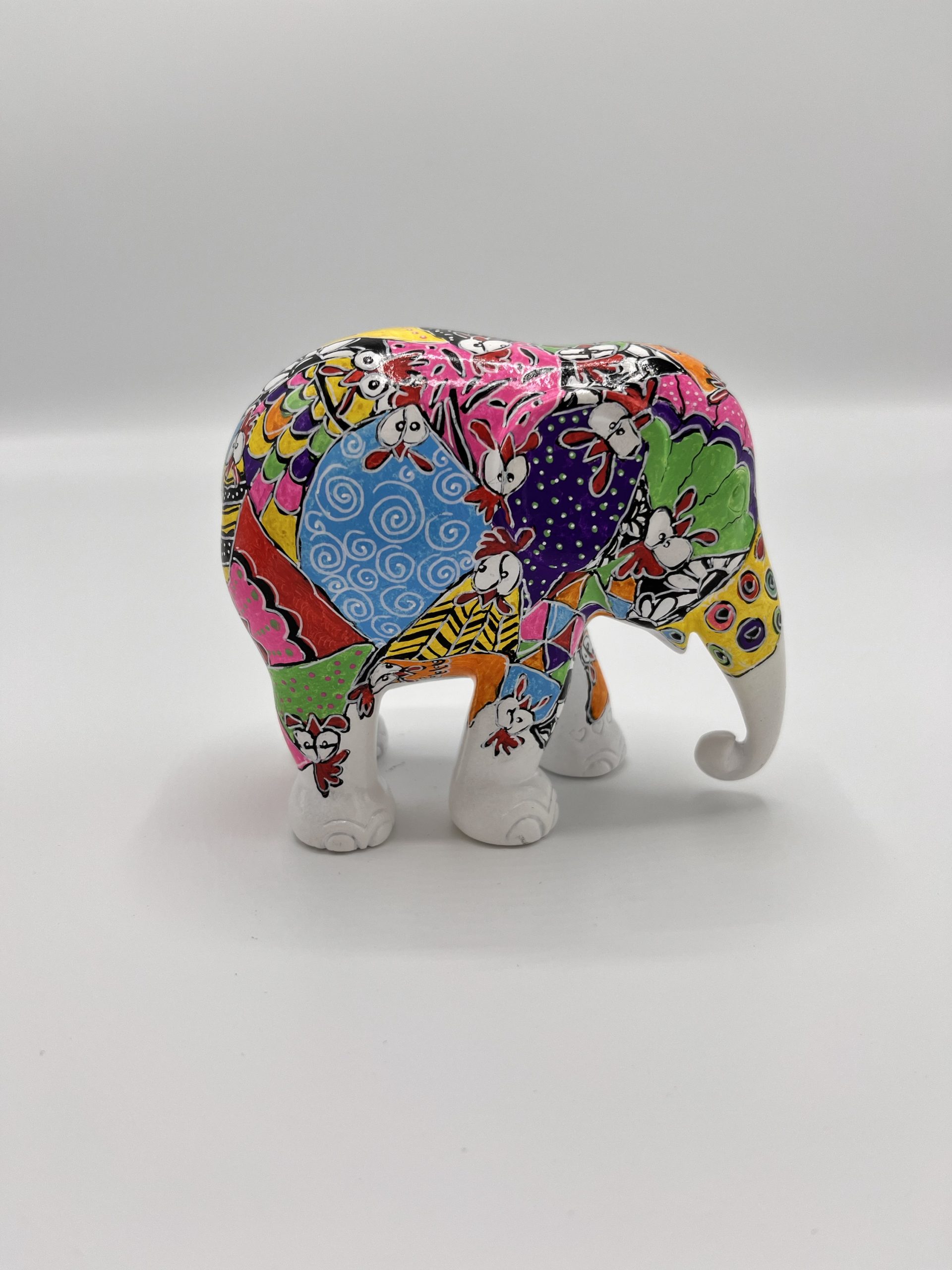 This unique elephant statue is a real eye-catcher with its vibrant colors and playful motifs. The statue is decorated with a mix of bright colors such as blue, pink, green and orange, combined with abstract patterns and spirals. A special detail are the funny white chickens that can be seen everywhere on the elephant’s body, which gives it a cheerful and quirky look. The white legs form a nice contrast with the colorful decoration, making this statue a perfect work of art for lovers of cheerful and eye-catching decorations.
