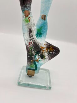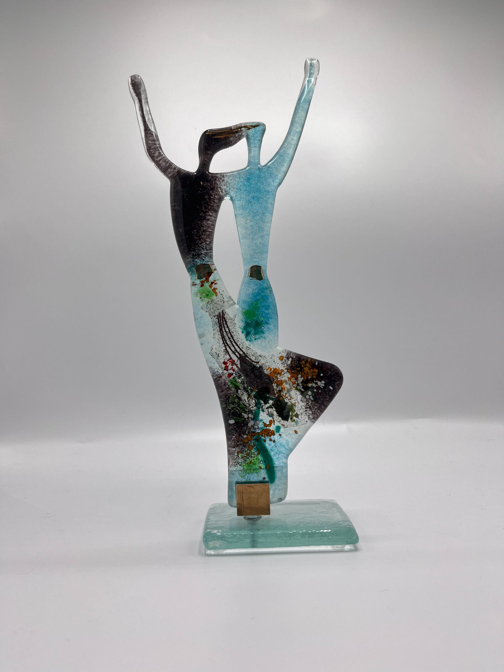 Bring movement and elegance to your interior with this unique glass artwork. This 30 cm high sculpture captures a moment of joyful expression in abstract form, where two stylized figures seem to dance together. Made of hand-formed glass in a harmonious mix of turquoise, black and transparent accents, and enriched with colorful inclusions of glass frit and metal foil, this sculpture exudes pure artistic finesse.