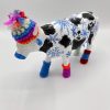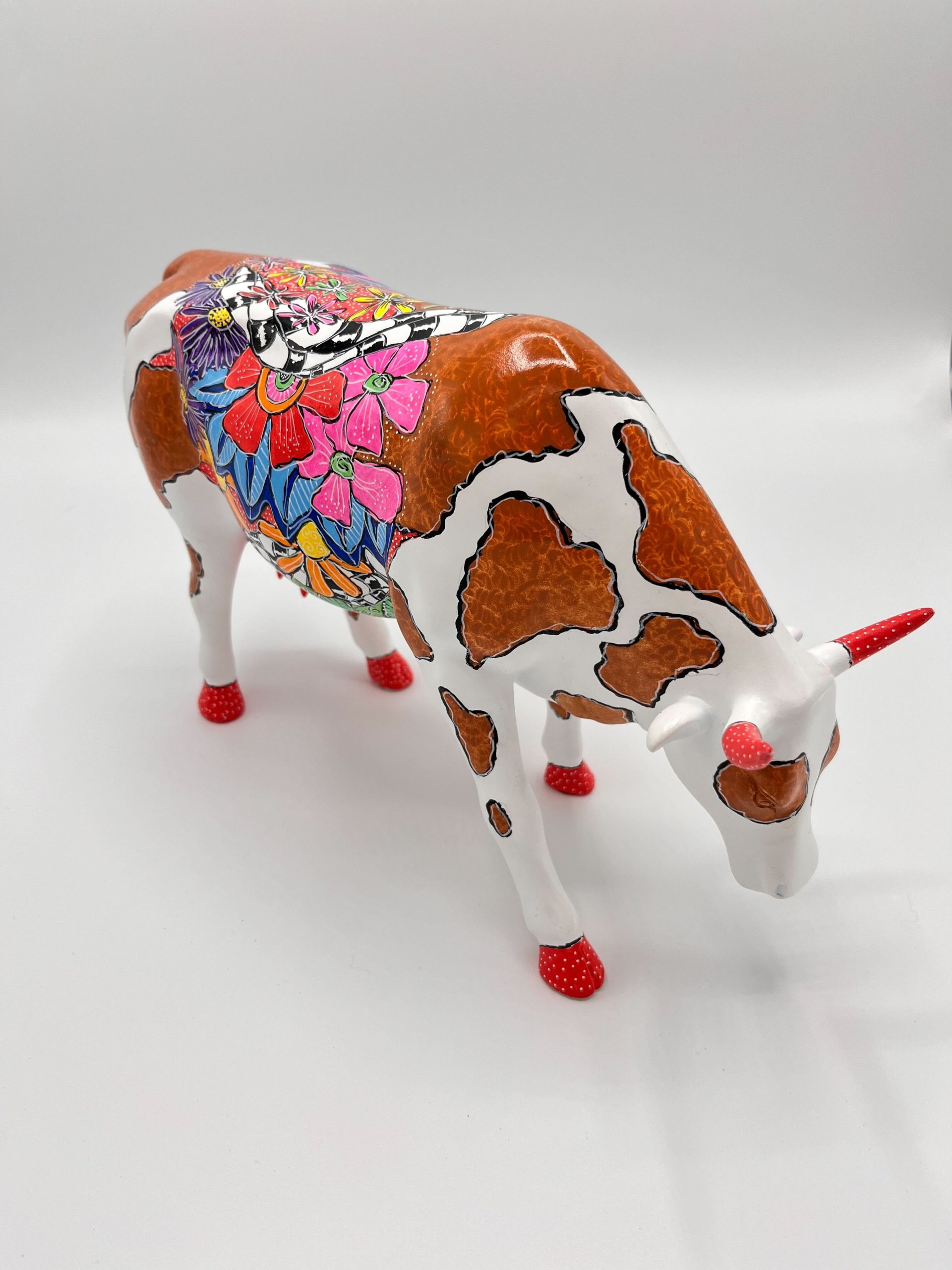 This artwork is called “Cow in Bloom,” painted by Ellen Moorman. The statue is a beautiful tribute to nature, showing a cow in bloom with a lush display of flowers on her back. The painting combines the natural pattern of the cow in a light brown color with lively flowers and playful motifs. The flowers on the back are colorful and detailed, with shades of pink, purple, yellow and orange, covering the center of the back. The hooves and horns are painted with a striking red-white dot pattern, which forms a playful contrast with the floral motif.