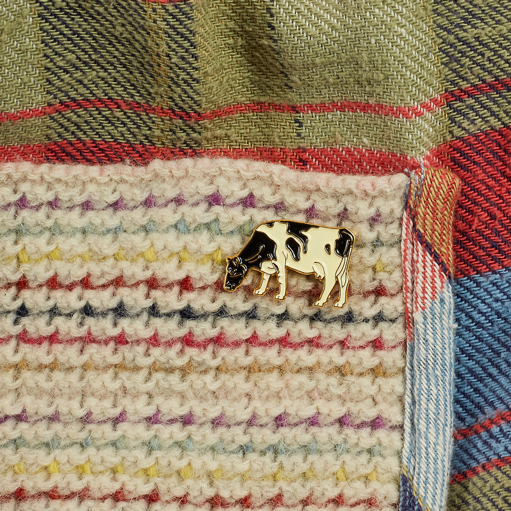 The cow is holy not only in India. Metal pin in the shape of a cow. Packaged on a 55 x 55 mm backing card made from FSC-certified recycled paper, sealed in a polybag with a convenient Euroslot for easy display.