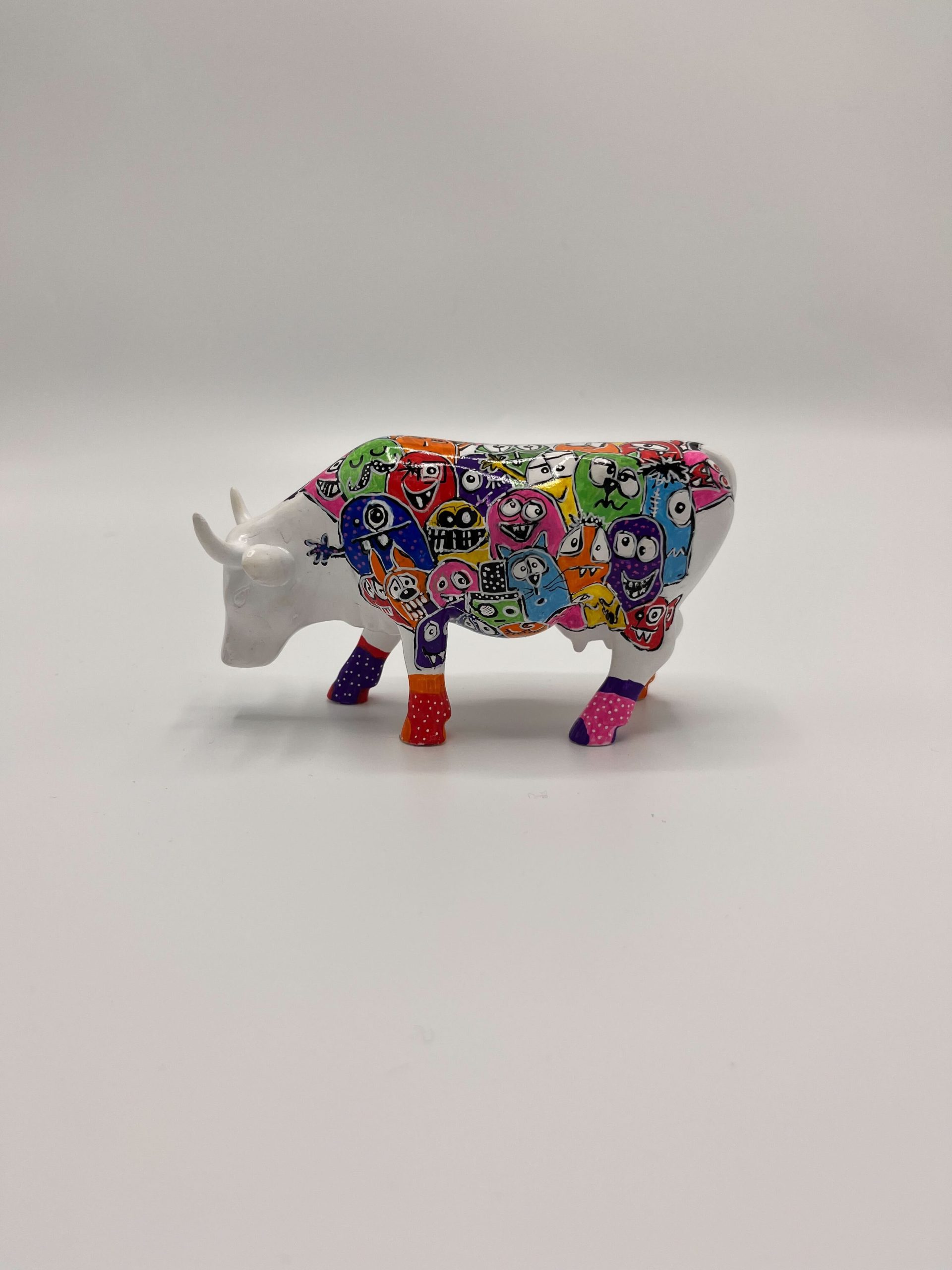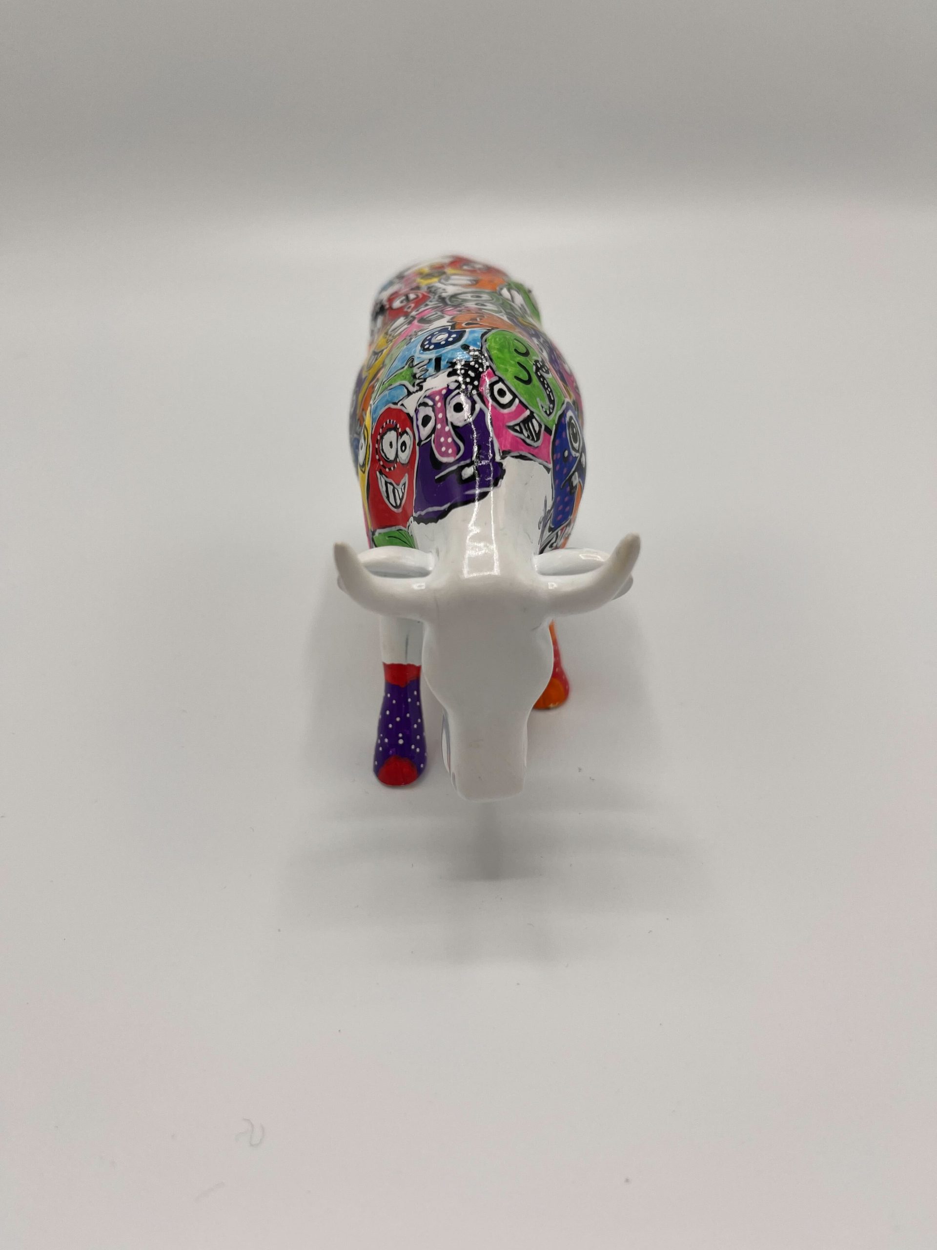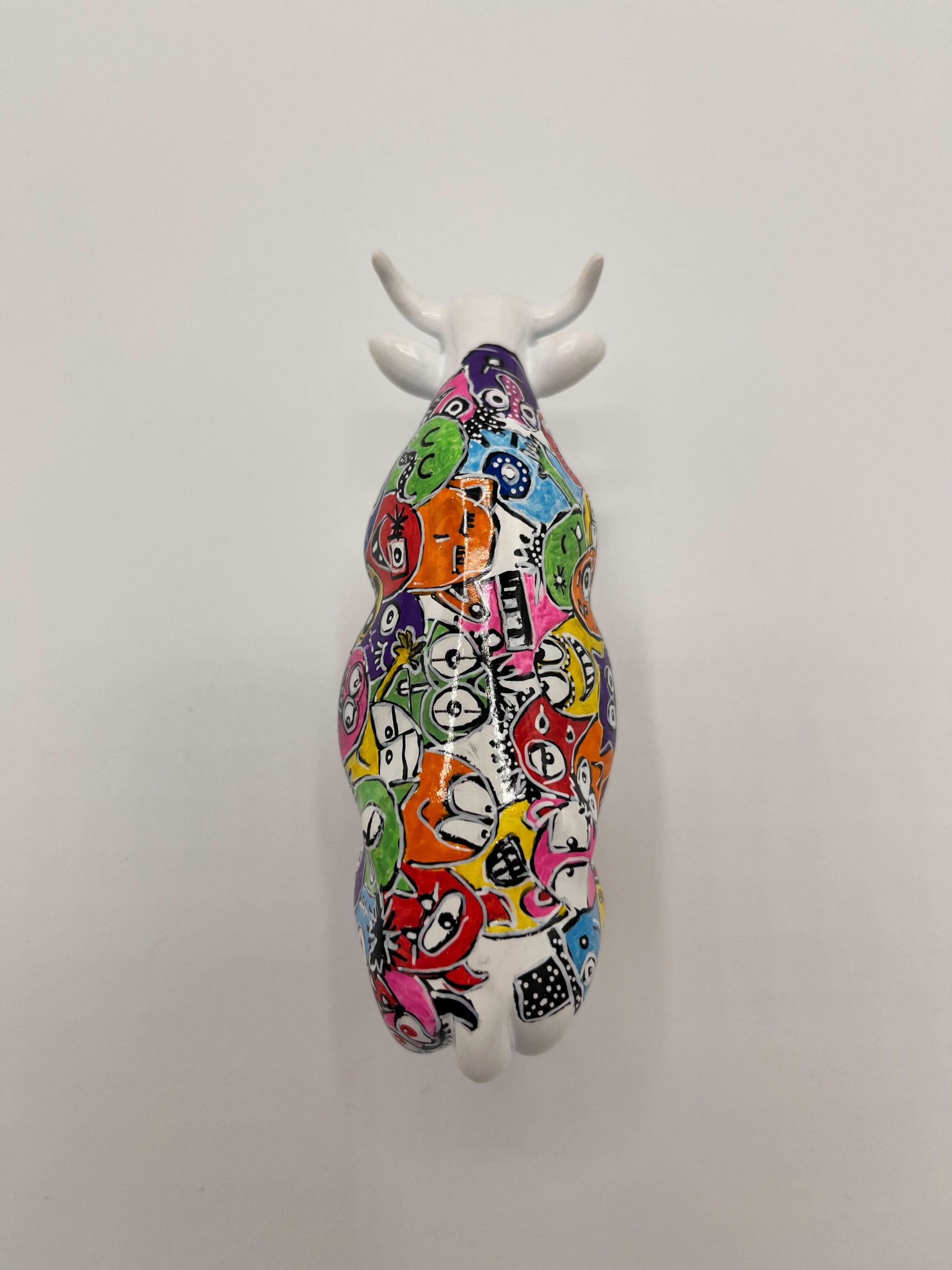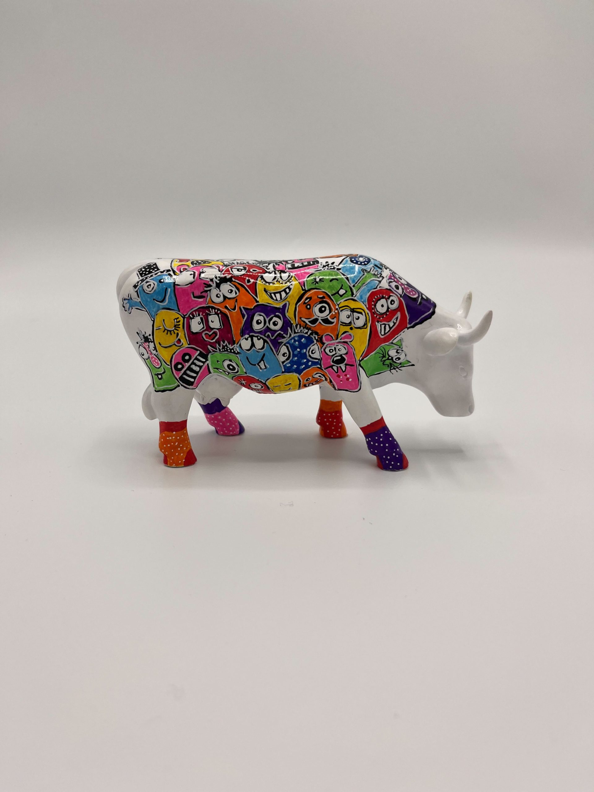 The statue depicts a cow, covered in a colorful collection of colorful, cartoonish faces and figures. The bright colors such as orange, pink, yellow, green, blue and red are beautifully combined with detailed patterns, which creates a cheerful and visually attractive whole. Each side of the cow reveals different funny and quirky faces, which together create a festive and enchanting work of art.