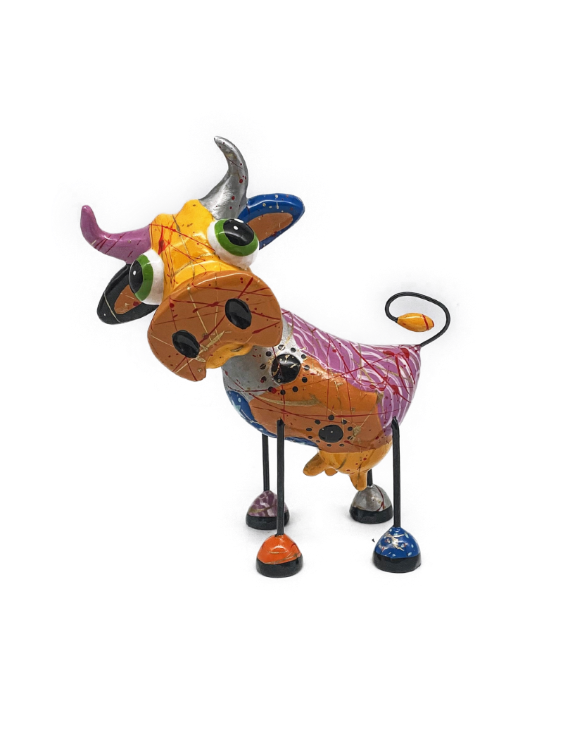 Bring a playful and colorful vibe to your interior with this cheerful cow statue! With its vibrant colors, funny expression and slender metal legs, this artwork is a real eye-catcher. The hand-painted finish and unique details, such as the large expressive eyes and playful patterns, make it a charming addition to any room. A perfect decorative piece for lovers of modern and humorous art!
