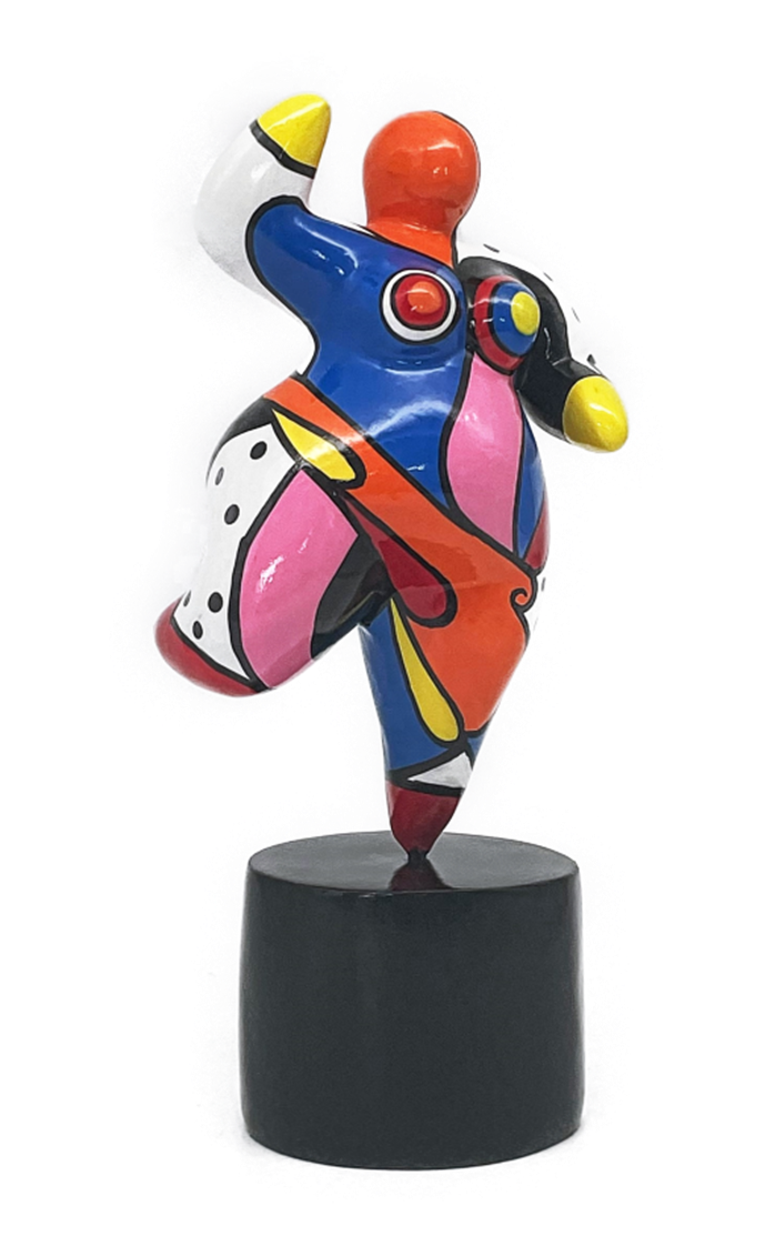 Bring colour and playfulness to your interior with this vibrant Dolly statue. Inspired by the art of Niki de Saint Phalle, this statue radiates energy and joy with its dynamic pose and expressive shapes. The statue is hand-painted in a mix of bright colours and graphic patterns, making it a real eye-catcher. Mounted on a sturdy black base, this work of art is perfect for lovers of modern and pop art sculptures. A unique decorative piece that will enrich any room!