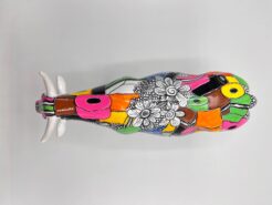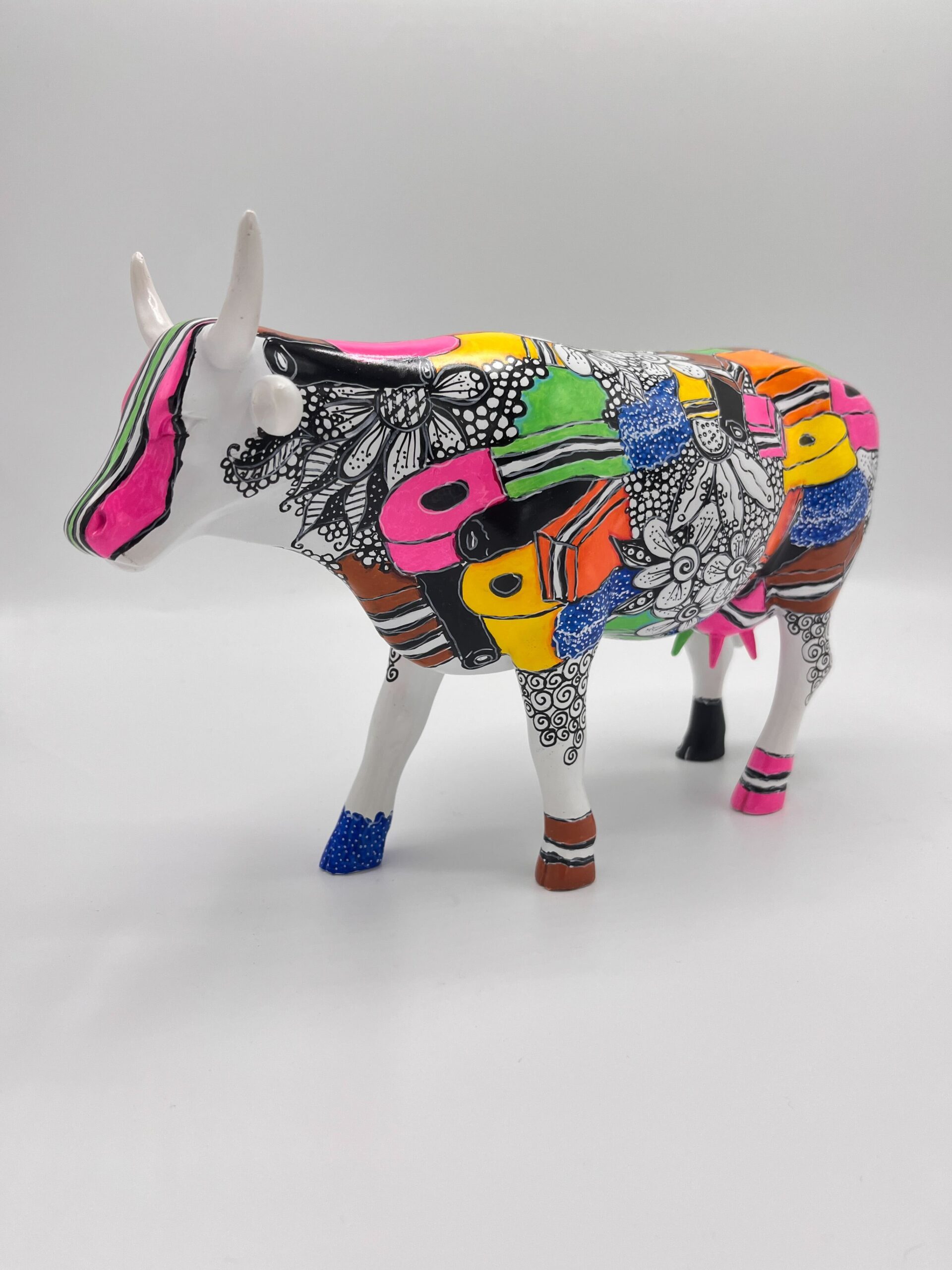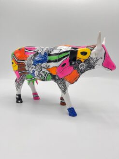 Let color and creativity fill the space with “D’rop of D’ronder”, a vibrant sculpture by artist Ellen Moorman. This striking bull is a celebration of color and pattern, in which graphic black and white flowers contrast with humorous English liquorice in neon pink, yellow, orange, blue, green and black. The composition is dynamic and playful, with a nod to abstract art and a touch of pop art.