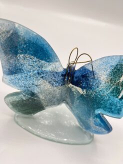 The butterfly shines in deep shades of blue, accompanied by soft green and silvery accents that are reminiscent of waves, whitecaps and the depths of the ocean. The transparent wings provide a light, airy appearance, while the hand-curved metal antennae give the whole a playful and refined character.