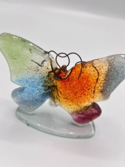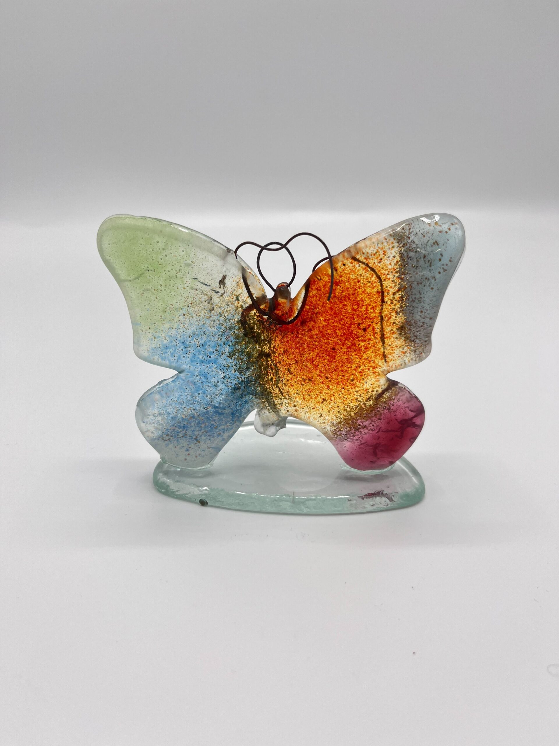 The butterfly shines with a harmonious mix of colours – from fresh green and bright blue to warm orange and deep pink. The colours flow effortlessly into each other, as if they are dancing on the transparent glass. The hand-forged wire forms graceful antennae, which gives the whole a charming and playful character.