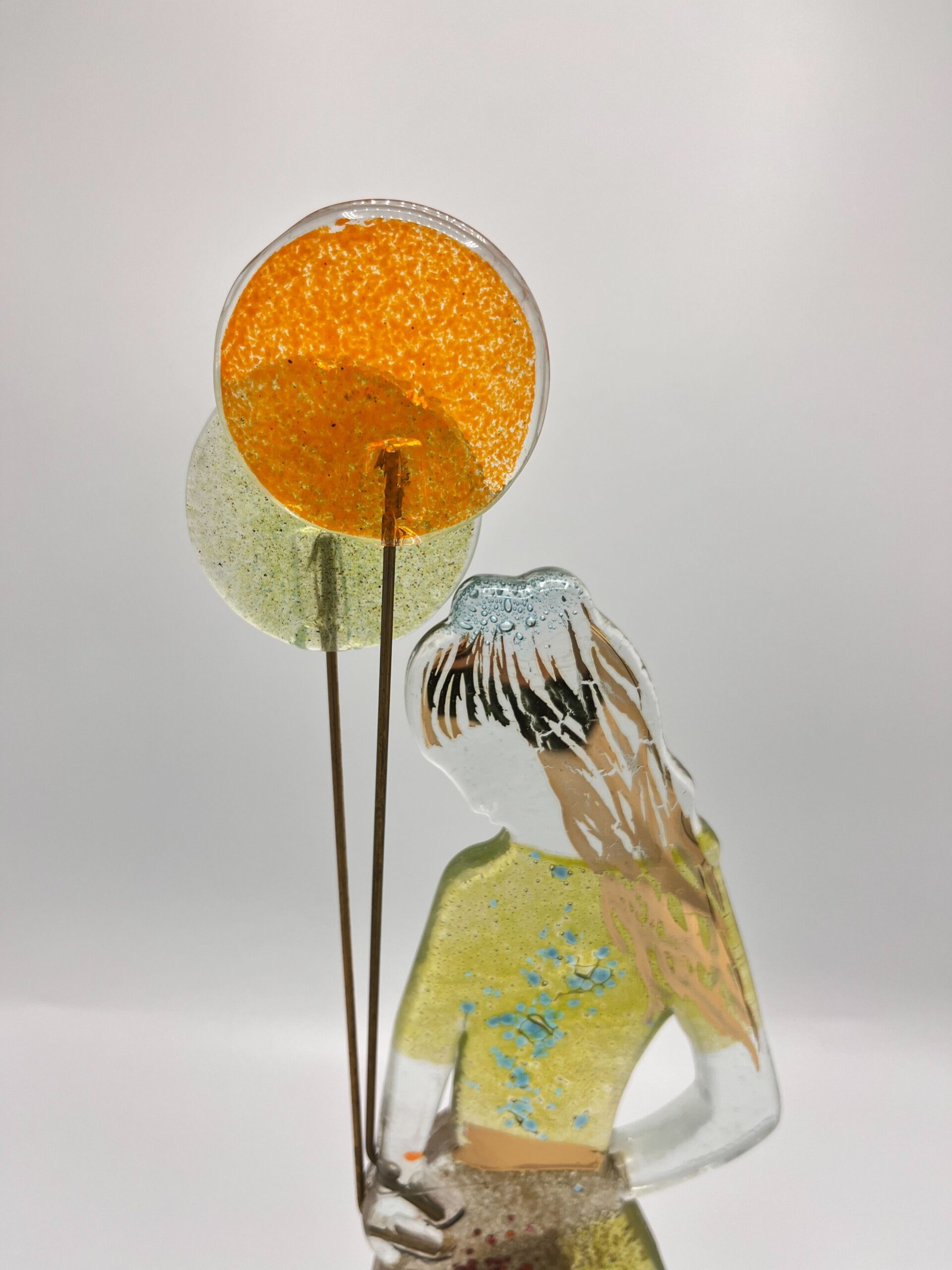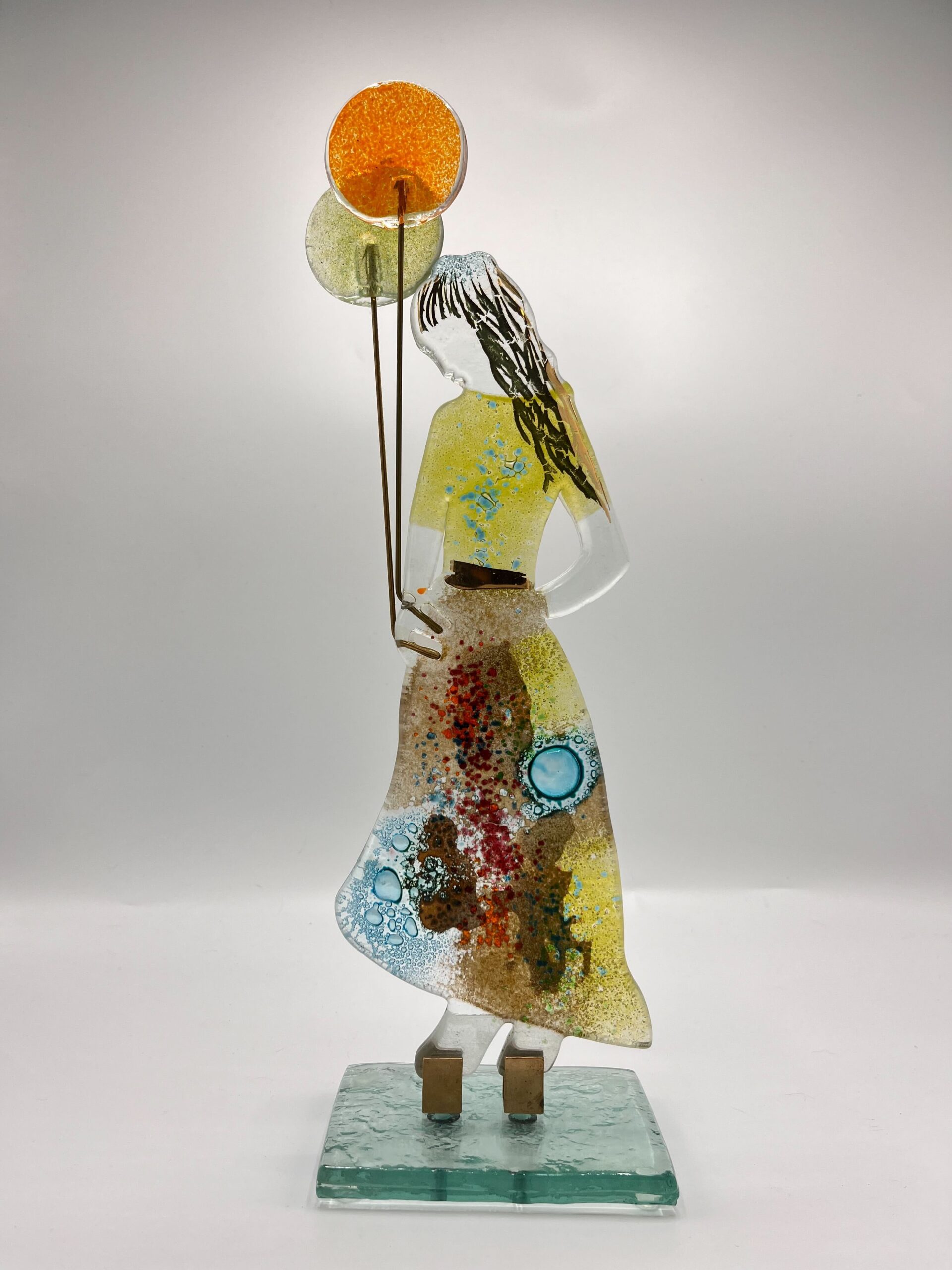 A sculpture full of softness and colour – this glass girl with balloons exudes a sense of playful elegance and wonder. With her gaze slightly averted and her long hair in the wind, she seems caught in a moment of silent daydream.