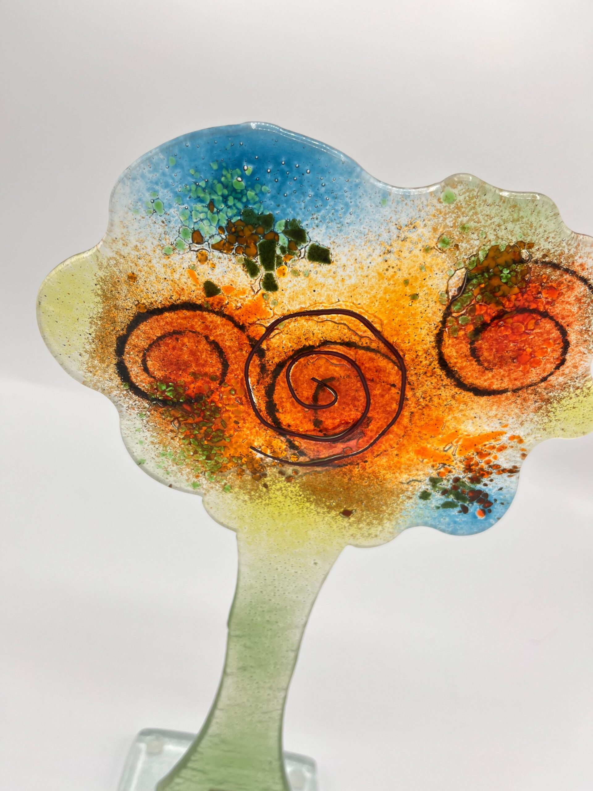 A colourful work of art full of fantasy and liveliness – this 32 cm high glass tree is a playful interpretation of nature, handmade with an eye for detail and colour experience. The wide, airy crown is an explosion of warm orange and red tones, combined with fresh green and sky blue, as if the tree is holding a piece of a summer sunset.
