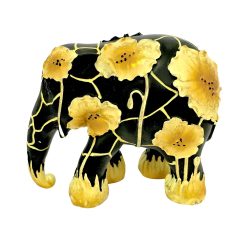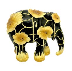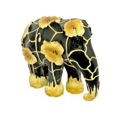 “The black and gold design found on this hand-painted elephant symbolizes happiness, success, attainment, and properity. Even within a field of darkness and unknown, a miracle can always bloom, If you follow your dream, you will one day emerge with happiness.”