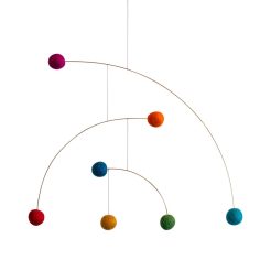 This hanging mobile with felt balls and brass adds colors and cheerful thoughts to your interior. The curved lines imply the movement of the bouncing colorful felt balls.