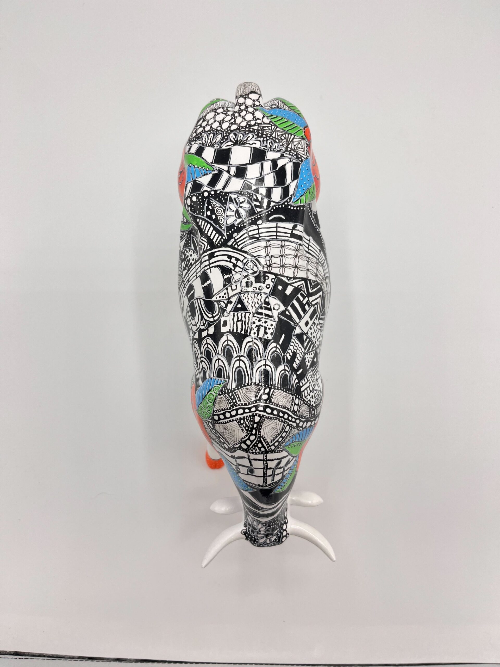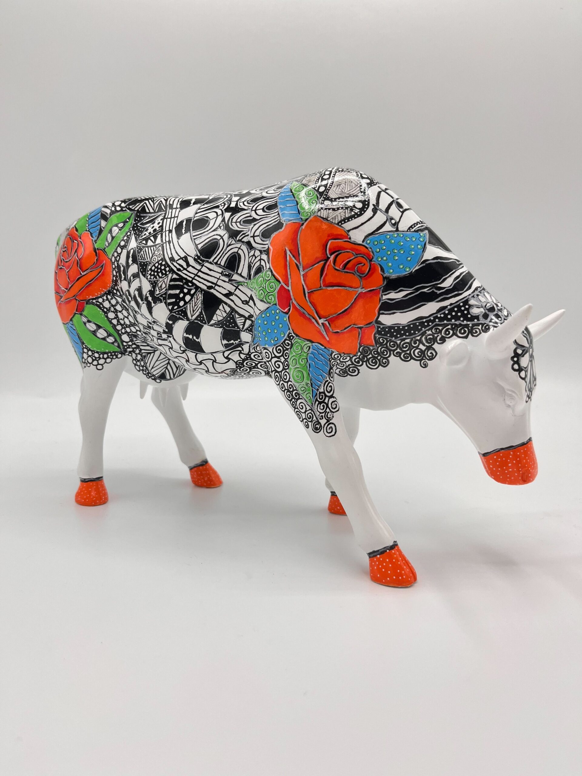 Bring an explosion of colour and character into your interior with “Kiss from a Rose”, a unique and expressive sculpture by artist Ellen Moorman. This hand-painted bull, with its stylised silhouette, is decorated with a striking black and white pattern that is reminiscent of Zentangle-like motifs. In contrast, the vibrant red roses with colourful leaves in green, blue and turquoise bloom elegantly from the abstract lines.