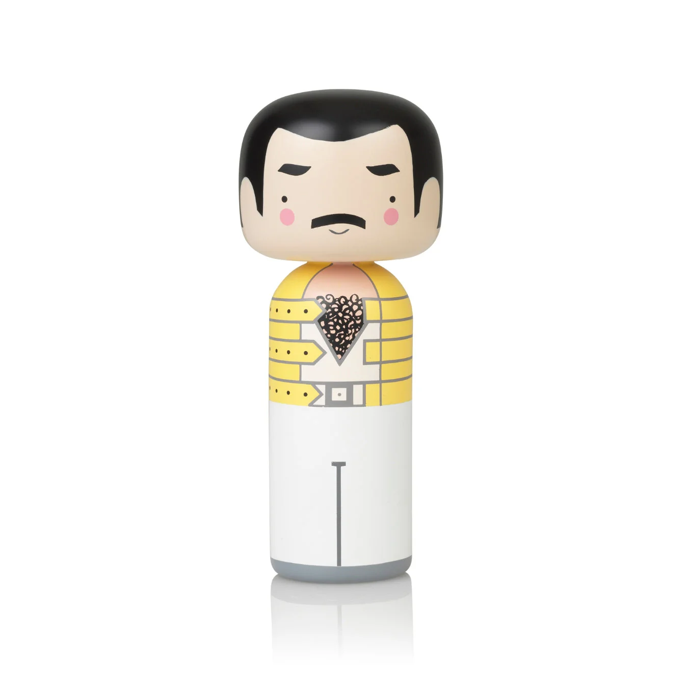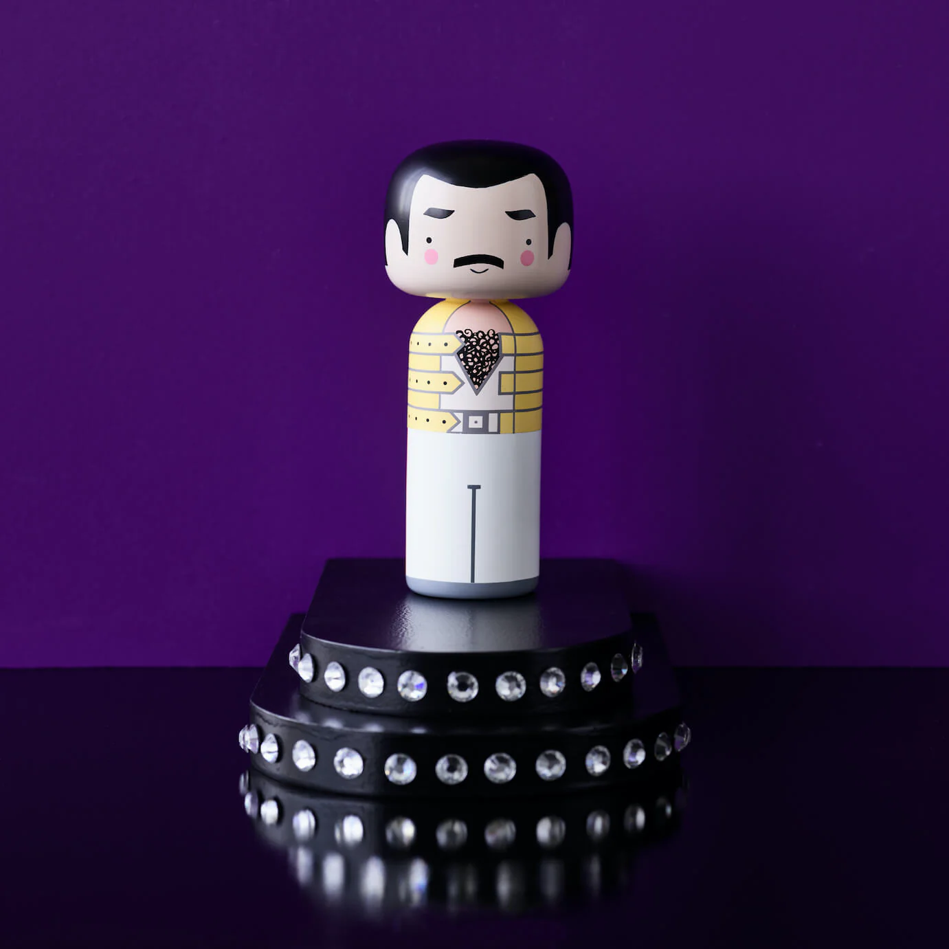 Freddie Mercury. one of the greatest rock legends in history. has left a significant impression on the world. His incredible vocal range combined with his flamboyant and theatrical personality. made him an artist in a league of his own. The design of the kokeshi doll is based on Freddie’s most iconic outfit; the yellow military jacket which he wore during the sold-out European “Magic” tour in 1986.