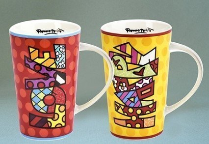 2 Mugs by Romero Britto “Mug, Love and Happy”.
