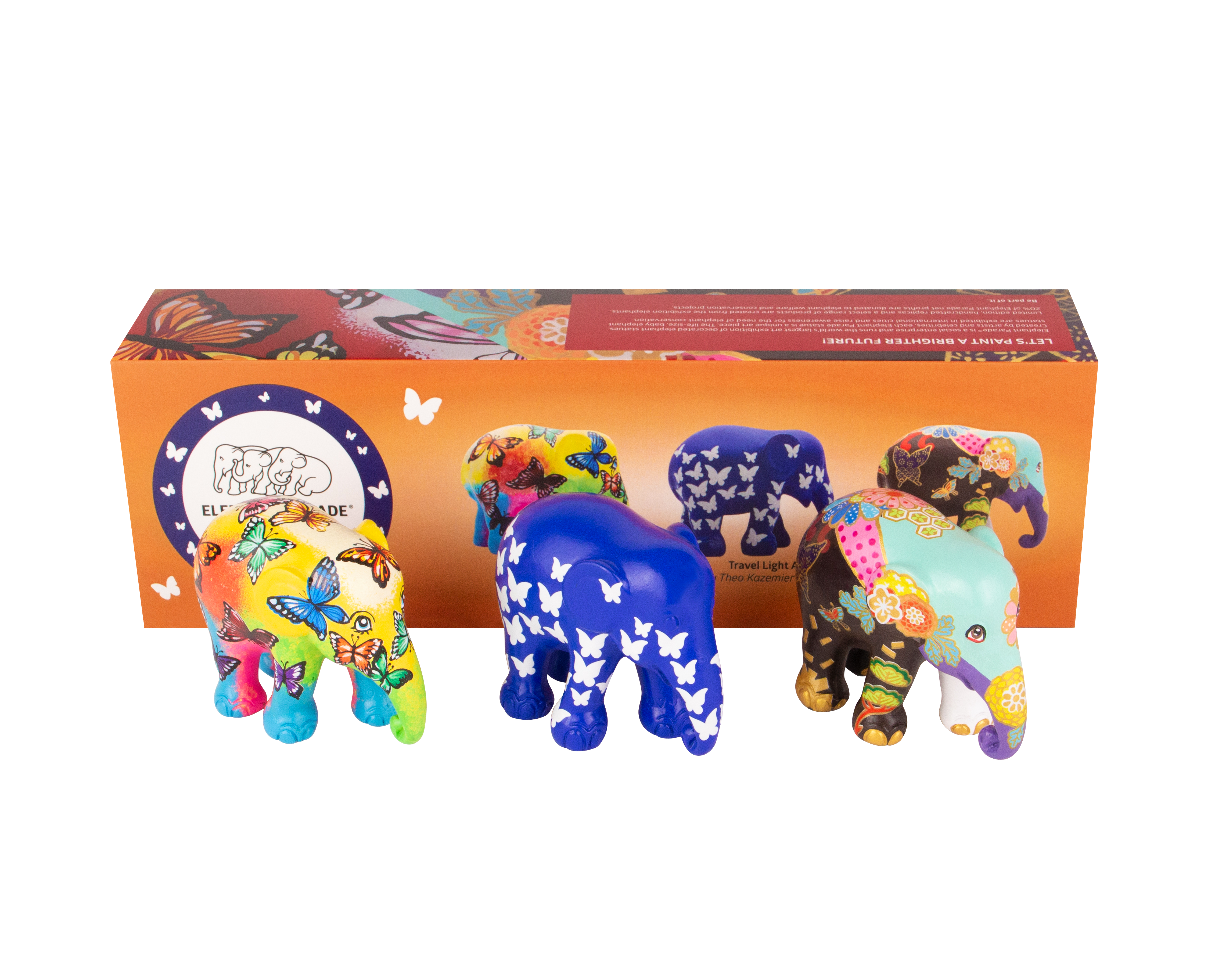 What’s better than one Elephant Parade elephant? Three! The Elephant Parade multipack comes with three 7 cm elephants, packed up in a lovely gift box. This pack features Beauty in Freedom by Noppawan Nuansiri, Travel Light Altar by Theo Kazemier and Kiku by Chris Chun.