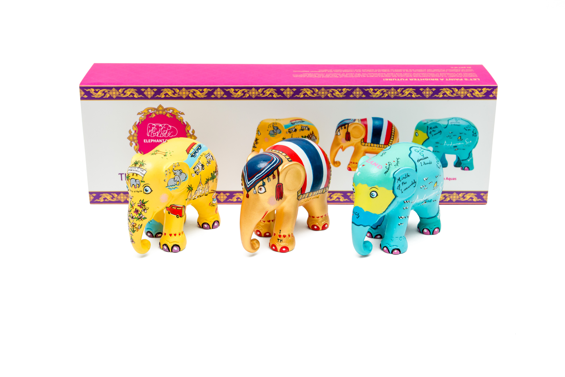 What’s better than one Elephant Parade elephant? Three! The Elephant Parade multipack comes with three 7cm Thailand inspired elephants, packed up in a lovely gift box. This pack features Land of Smiles, Home is Where the Heart is and Andaman Aquas by Diana Francis.