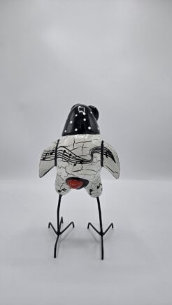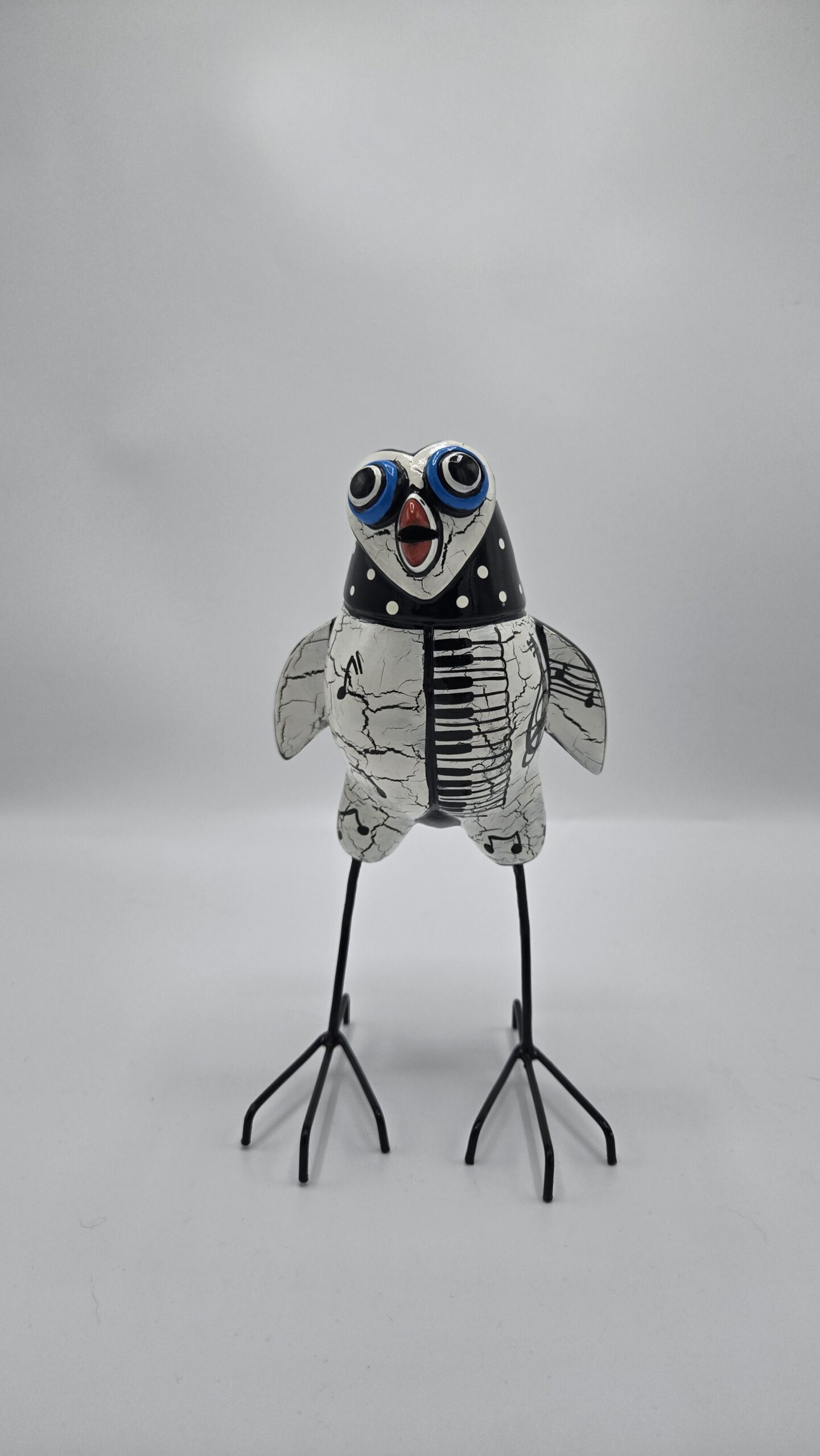 Be enchanted by this expressive “Musical Owl,” a unique, handmade sculpture by Dutch artist Jellie van Kranen. This cheerful bird sculpture combines playful design with musical elements: a black-and-white piano key print on the front and graceful musical staves across the body, finished in her signature crackle finish.