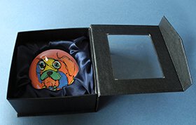Nice paperweight. Material is glass. Flat at the bottom and convex at the top.