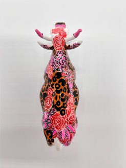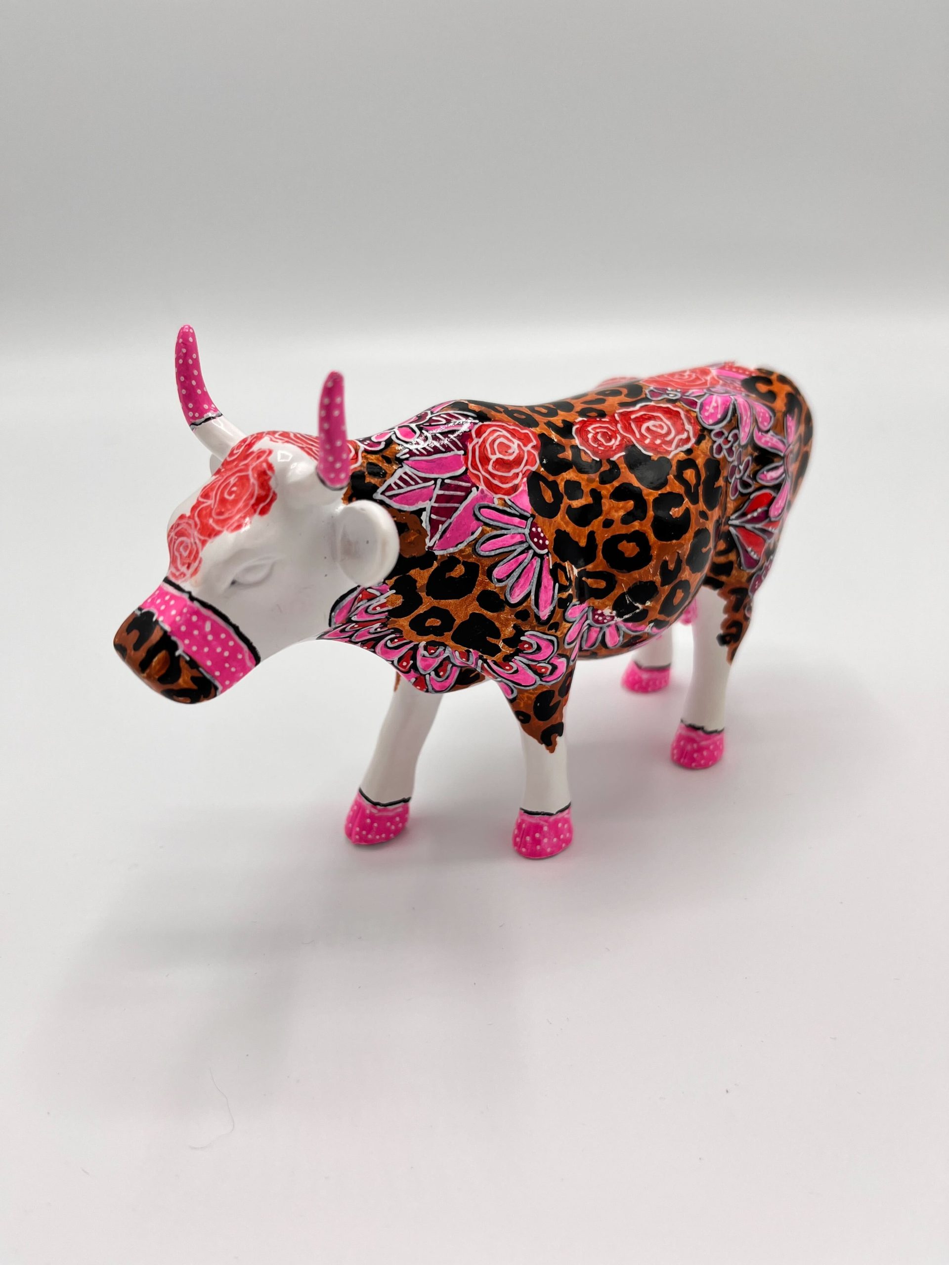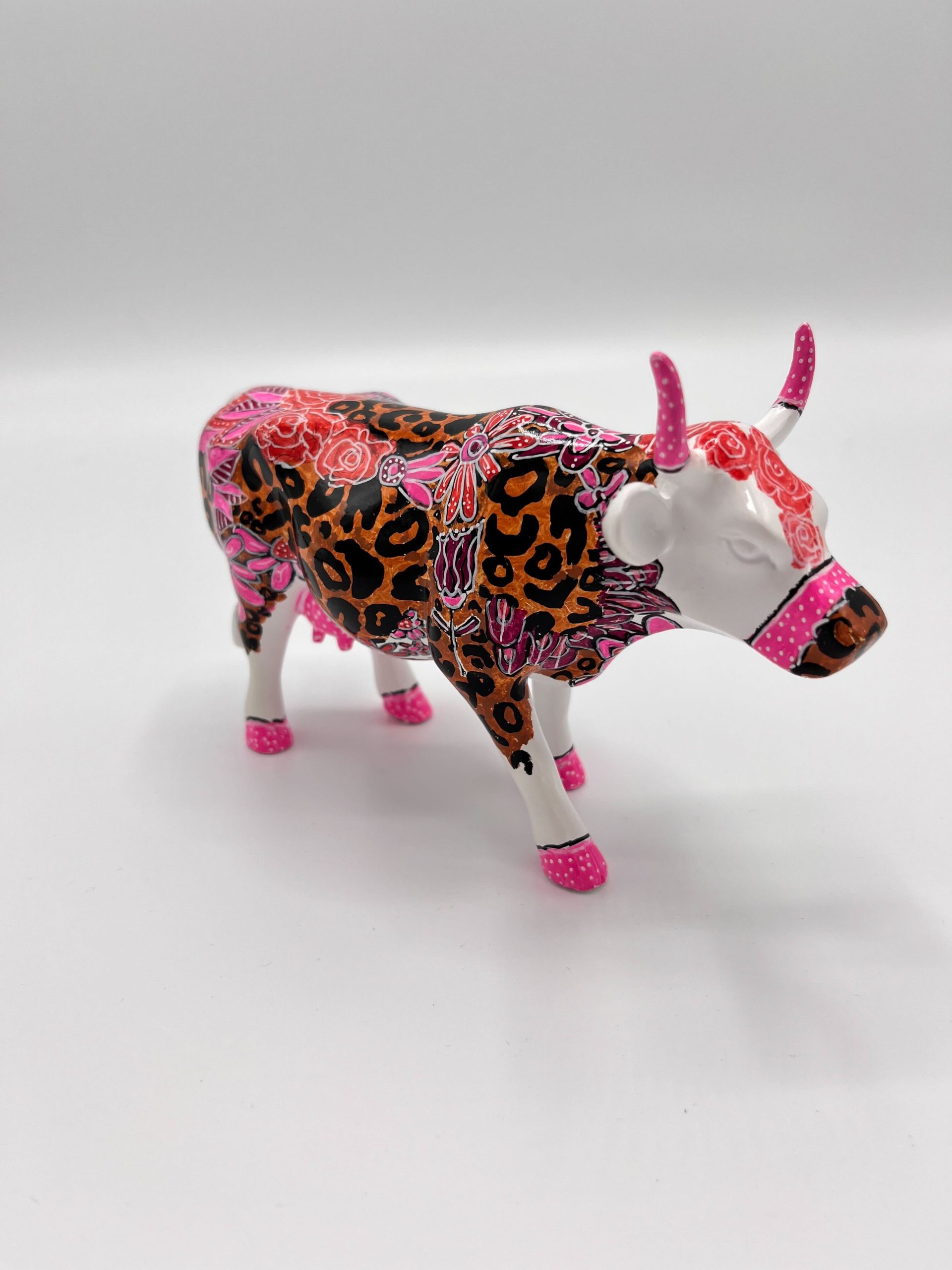 The background of the statue is covered in a vibrant brown and black leopard print, creating a bold and modern look. Delicate pink and red flowers are painted over it, which gives the statue a surprising, feminine twist. The cow’s horns, hooves and snout are finished in a playful pink color and feature a dotted pattern, which provides a unique accent and a cheerful appearance.