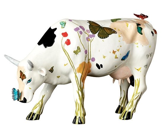 Ramona is a beautiful, detailed cow. A combination of wild flowers and butterflies on a white background. On her back and nose are two butterflies, these details make the cow even more elegant.
