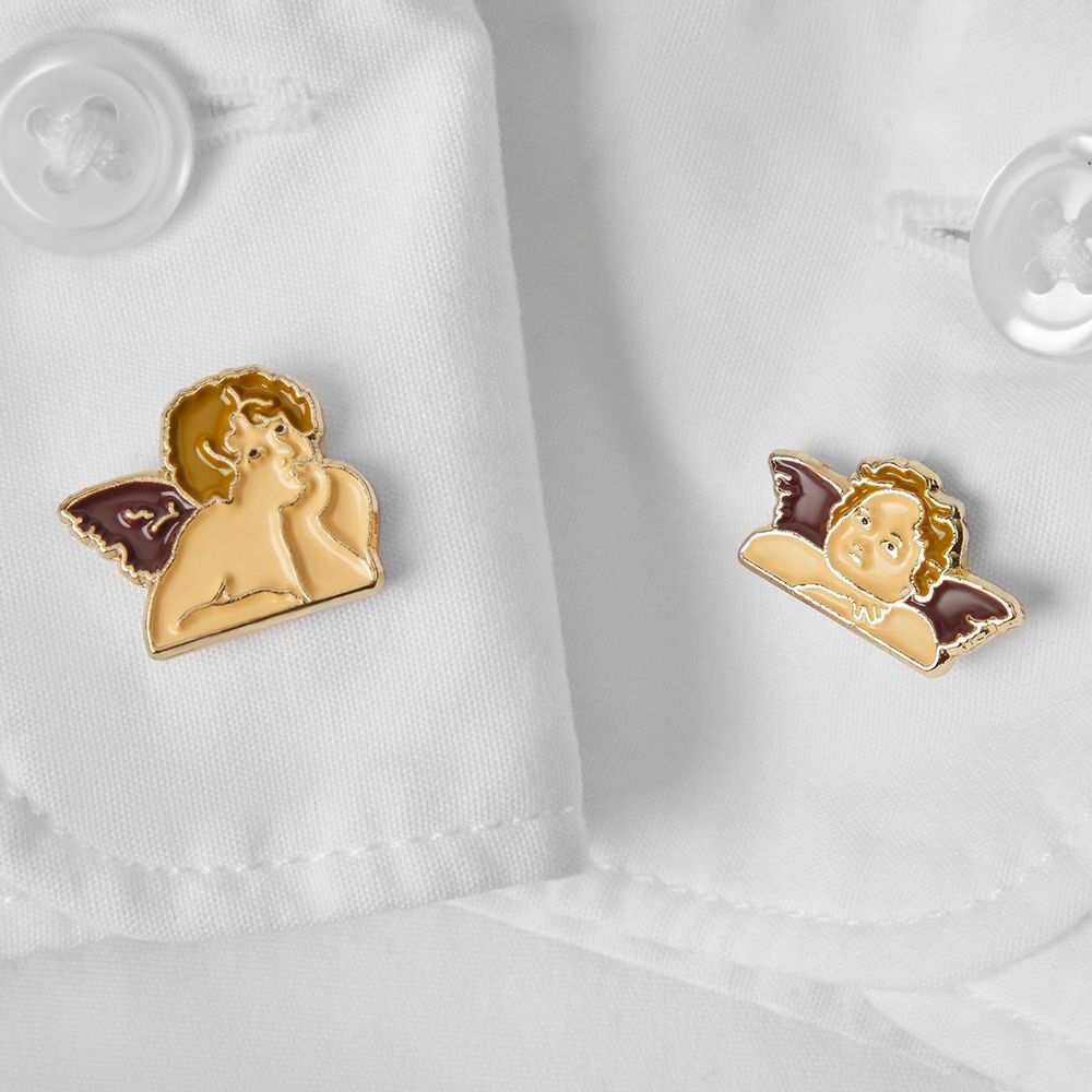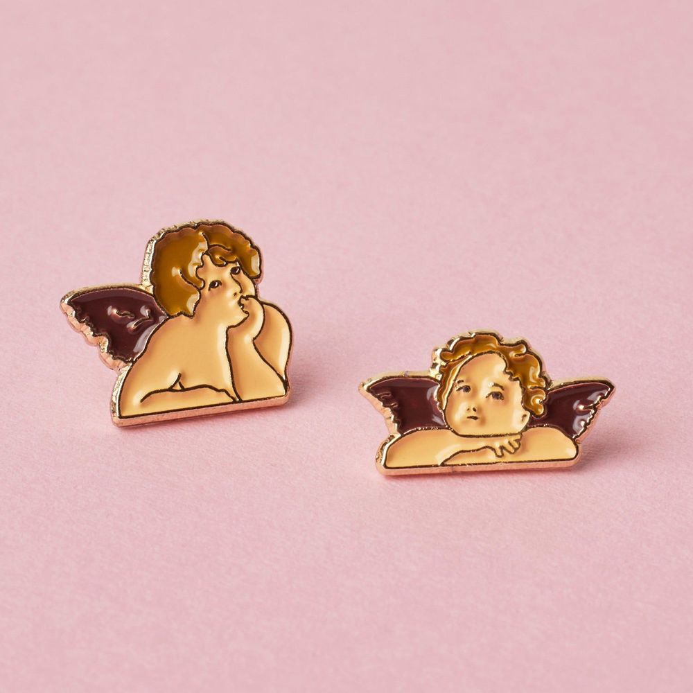Divine inspiration in miniature form. Set of two metal pins replicating Raphael’s Sistine Madonna, 1512–1513. Packaged on a 55 x 55mm back card made from FSC certified recycled paper, sealed in a polybag with a handy Euro slot for easy display.