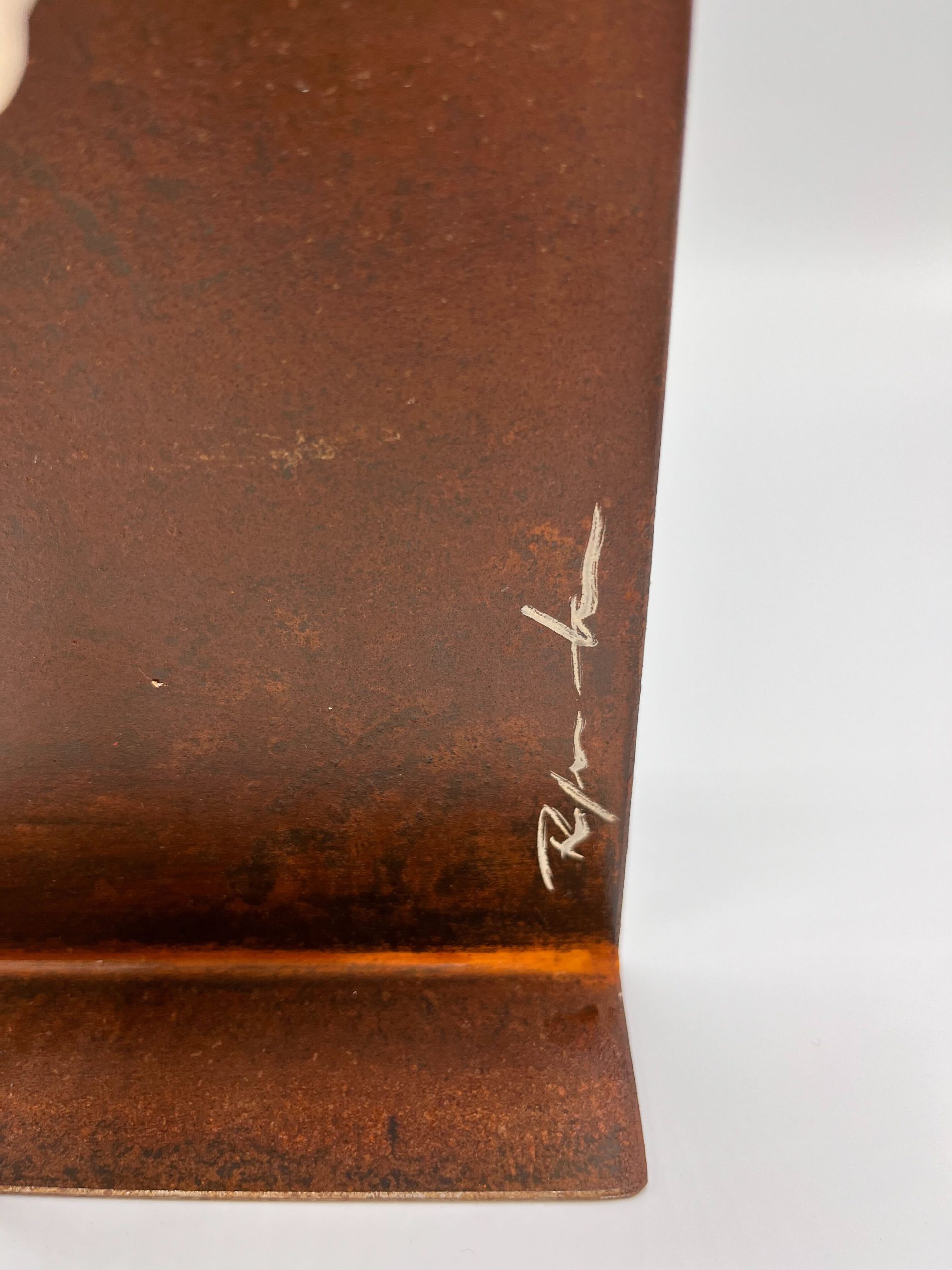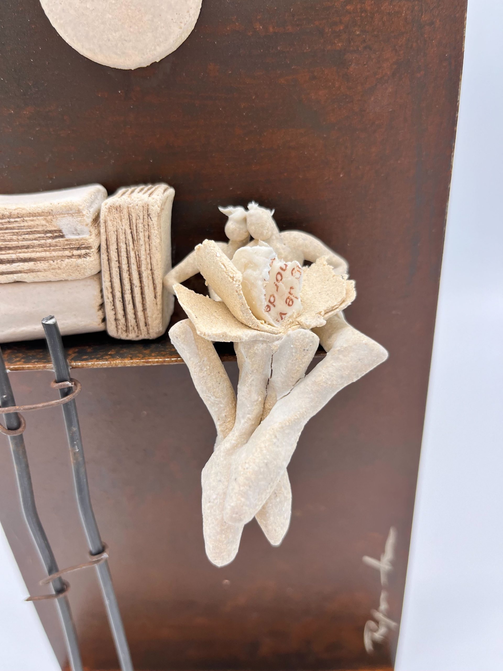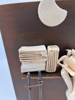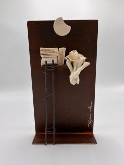 This beautiful and intriguing artwork by Roser Oter, entitled “Under the Moon,” combines subtle earthy tones with a minimalist, yet deeply expressive design. The piece consists of a robust, rust-colored metal panel that serves as a backdrop for delicate ceramic elements. A crescent moon floats at the top of the work, and beneath it are stylized shapes reminiscent of books, a ladder and a mysterious, abstract flower or figure, all executed in natural shades of ceramic.