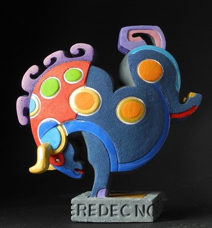 His work is vigorous, powerful, original and innovative. The confrontation between a sculpture or a canvas and Van Dommelen evokes a powerful sensation, fed by the paradoxical tension between an almost primitive language of shapes and clearly referring to age-old art forms conveyed in a dynamic, vibrating and very modern colour scheme.